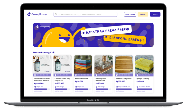 What makes it different from other e-commerce? Borong Bareng provides collective buying feature which enables local manufacturers to sell their products online, without worrying about the production cost.