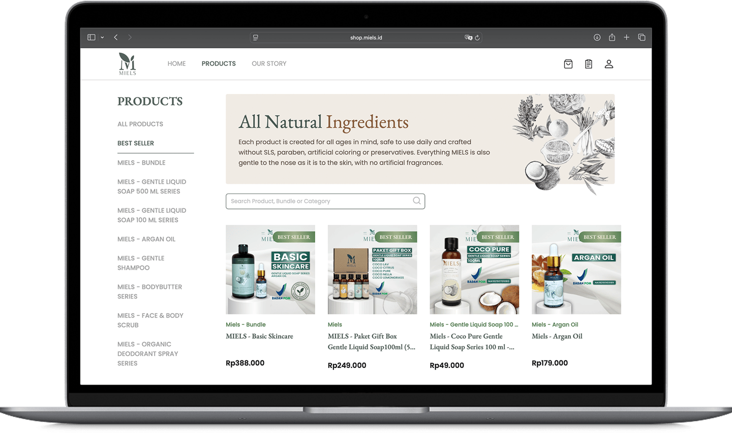 Adapun Miels Shop juga memiliki fitur tambahan khusus, seperti sistem affiliate, bundling produk, voucher, event, dan fitur lainnya yang disesuaikan dengan kebutuhan brand.